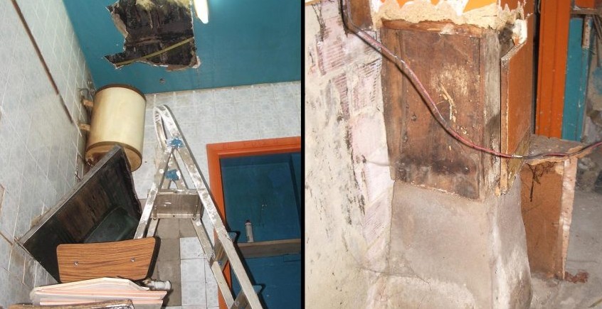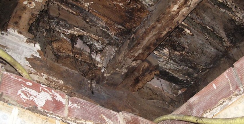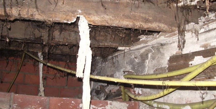 En el edificio surge la necesidad de rehabilitar el suelo del patio interior. El local inferior lleva mucho tiempo vacío y no ha sido objeto del mantenimiento necesario. Se evidencia la aparición de xilófagos y humedades por una filtración del patio.